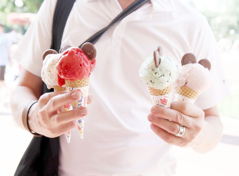 Det är varmt och skönt, så glassen började smälta direkt som ni ser. Och titta hur de dekorerat glassarna med choklad som Musse Pigg-öron. Här hade jag faktiskt tänkt vara liiitet sundare, och valde en strut med sorbetglass. Men Jackie tyckte inte om sin gräddiga jordgubbsglass, så det var bara att byta med henne… ;)