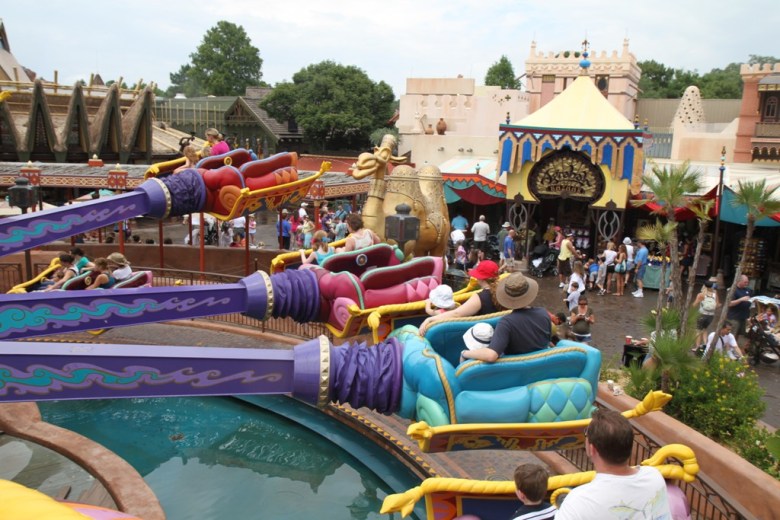 Många olika attraktioner som barnen älskade. Här är det Alladins flygande matta över marknaden i Agrabah.