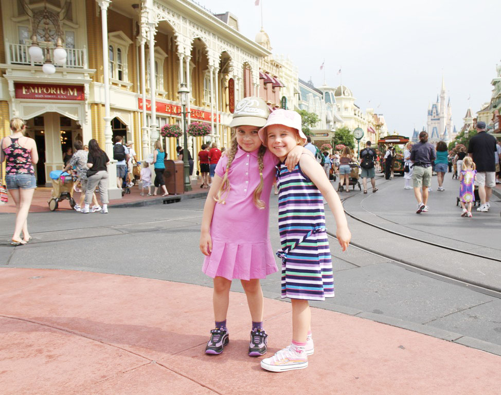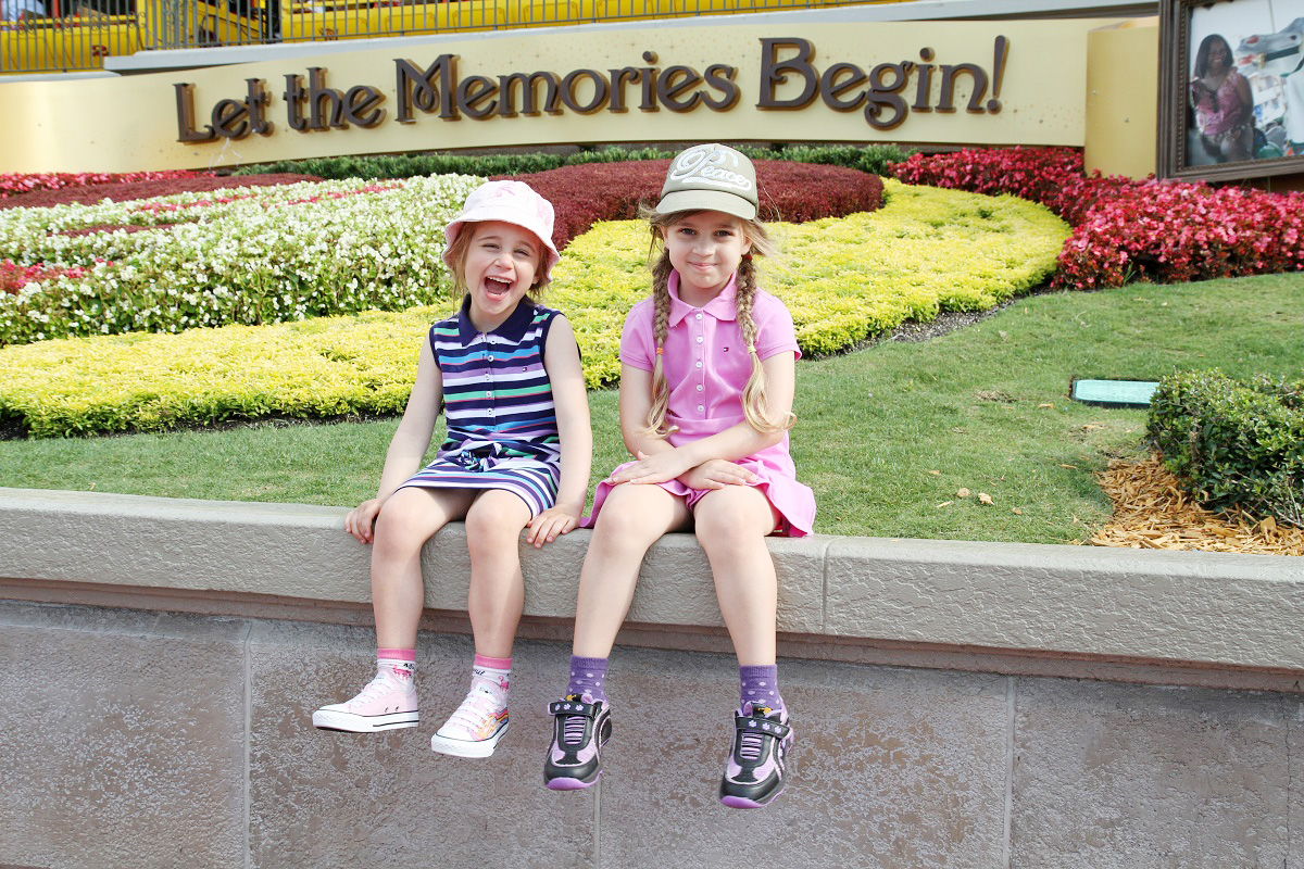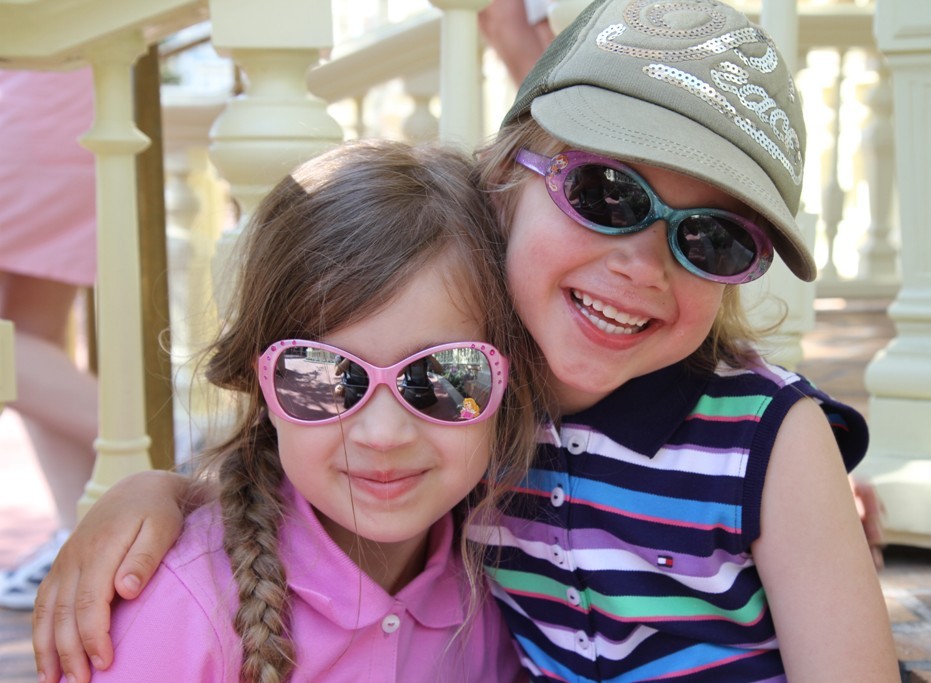 Två lyckliga tjejer i nya klänningar som vi shoppade väldigt billigt i Sawgrass Mills Mall, och nya solglasögon med Törnrosa och Ariel.