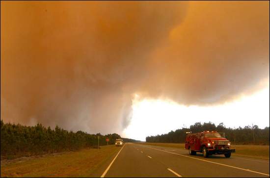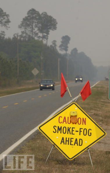 När vi kommit litet utanför Jacksonville blev himlen plötsligt helt rödgrå och det kändes som det skulle bli storm. Men vi kände en konstig doft också… Bilderna här har jag lånat, men det var precis så grått som på bilden, men överallt, inte den minsta ljusglimt eller blått någonstans… Det kändes som att plötsligt vara med i Twilight Zone eller i Arkiv X…