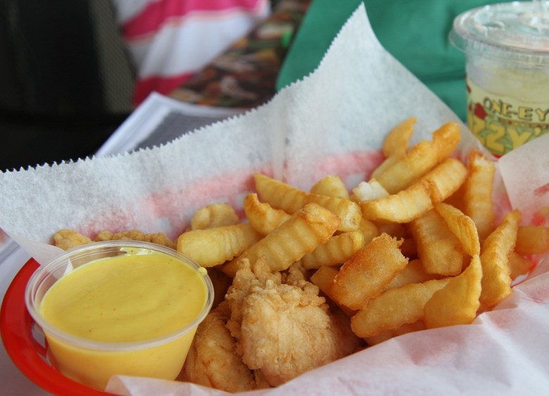 Det här var en barnmeny. Men ni ser ju hur mycket majonnäs det är till, och allt, precis allt, skall nödvändigtvis friteras..! Eller täckas med ost…