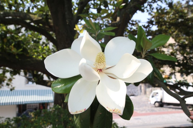 Magnoliaträden blommar här, och det är så vackert. Jag trodde magnolior bara var ganska små blommor, men titta bara!