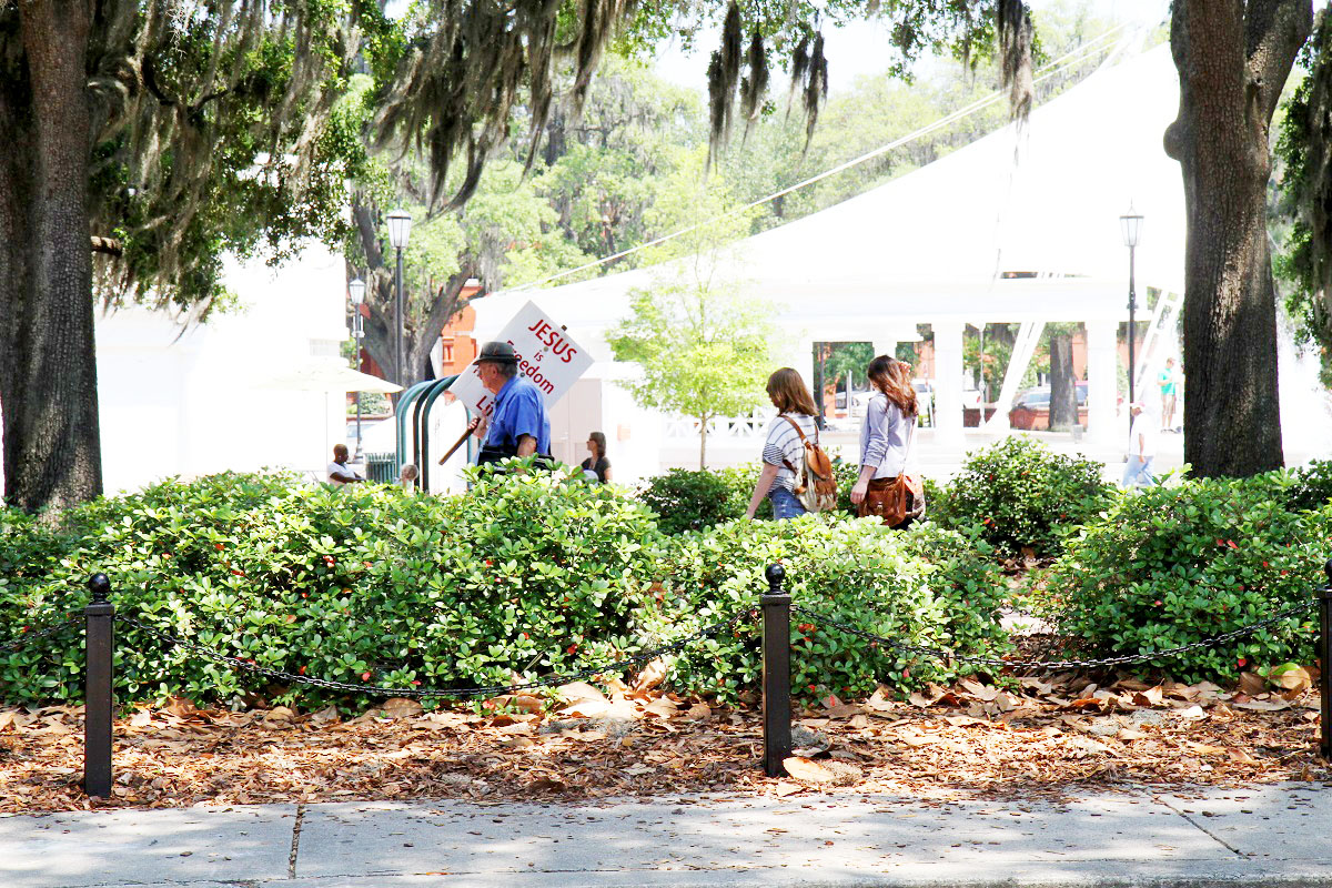 Ingen vanlig syn hemma i Sverige, men här reagerar ingen på en man som går omkring med ett Jesus-plakat.