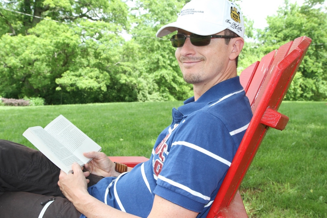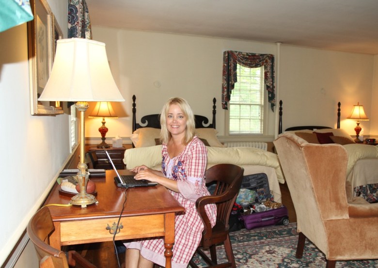 Det finns internetmöjligheter, men vi har ingen TV. Här skall vi nu stanna två nätter, och det skall bli så skönt att vandra omkring på ägorna, sitta på en stor veranda och läsa böcker och tidningar, bara vila.