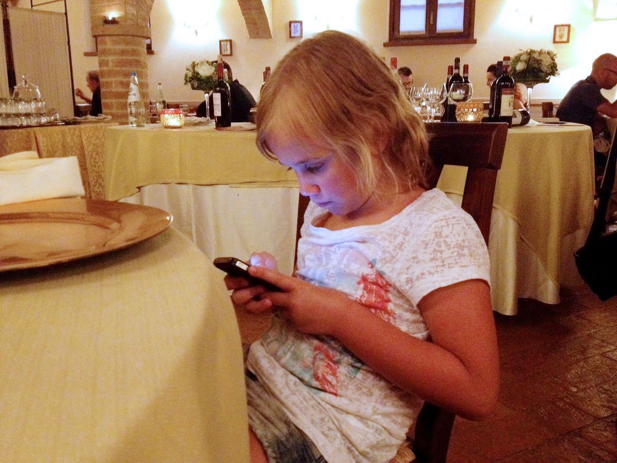 På kvällarna provade vi traktens olika specialiteter, som till exempel maträtter med tryffelsvamp och den otroligt goda osten pecorino. Det tog lång, lång tid att få in den mat vi beställde, men barnen var otroligt tålmodiga och underhöll sig med spel på våra mobiltelefoner. En kväll kom ett tyskt par fram till oss, tog i hand och berömde oss för att vi uppfostrat våra barn så bra. Jag blev så överraskad, glad, stolt och rörd, allt på en gång, att jag blev alldeles tårögd.