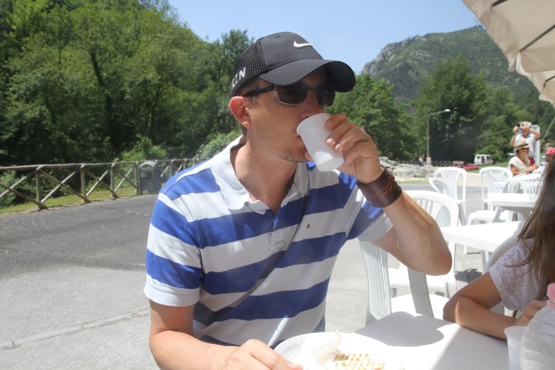 Ganska jobbigt att vandra hela vägen nedför slippriga och sluttande vägar… Jag och tjejerna väntade vid serveringen under tiden Patrik gick hela vägen upp igen för att hämta bilen. Lyx!