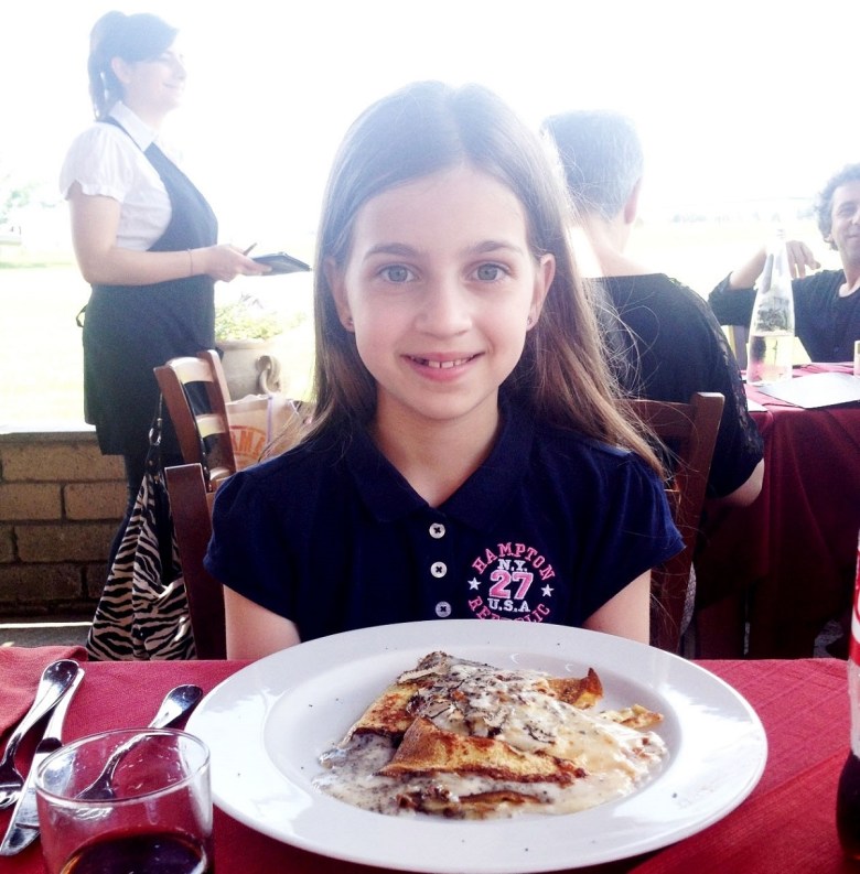 På vägen upp från Rom mot Montepulciano stannade vi och åt lunch i Fiano Romano på en restaurang som vi kollat upp innan; Lele Ai Casali. Maten var verkligen gudomligt god. Isabella valde crêpes med tryffel och pecorino, den goda osten som vi åt massor av under vår resa.