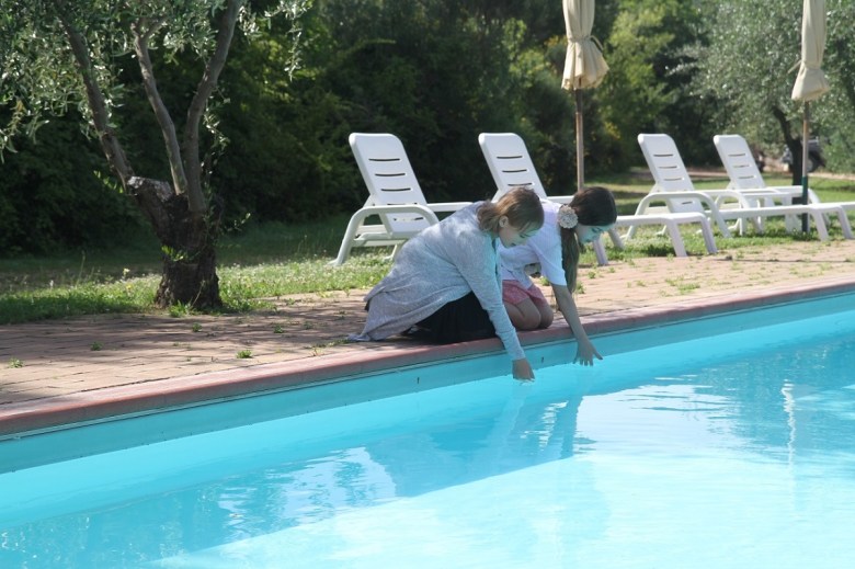 Första kvällen var det varmt, + 26 grader, men det både regnade och åskade, så det blev inget bad i poolen. Men en titt på poolen måste man ju ta, så att vi visste vad som väntade oss dagen efter.