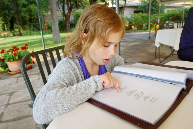 Jackie kollar in menyn. Första kvällen regnade och åskade det, så när det blev dags att beställa in antipasti flyttade vi in i själva restaurangen istället.