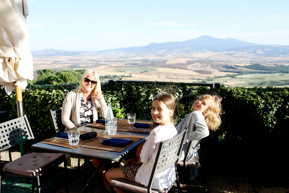 Titta bara vilken fantastisk utsikt vi hade från vårt bord… Böljande kullar, cypresser och pinjeträd…