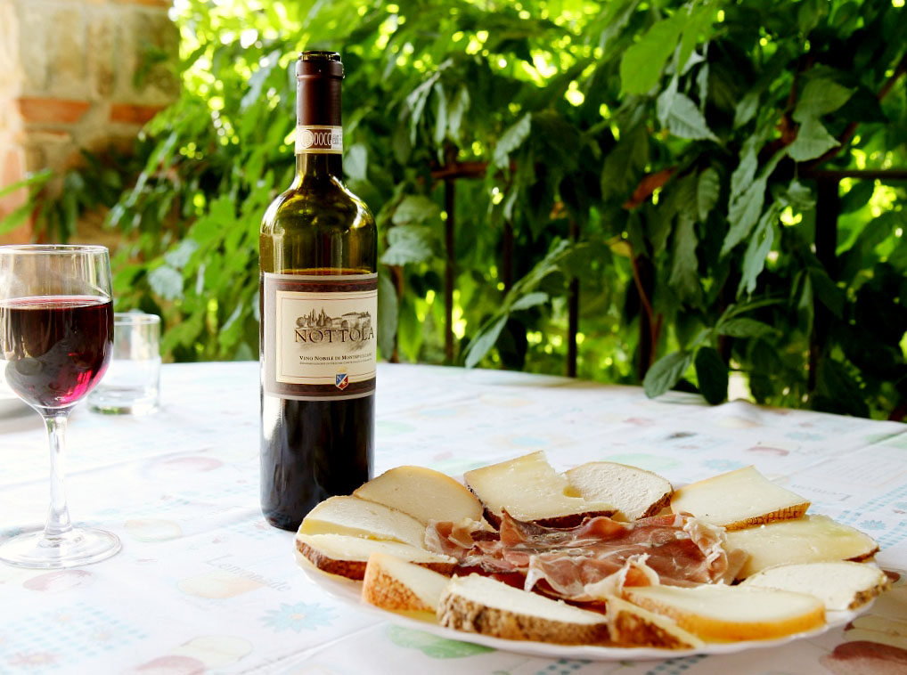 Innan middagen njöt vi av pecorino med tre olika långa lagringstider. De är alla helt underbart goda, men smakar olika och har olika hårdhet. Jag tyckte bäst om den krämiga som bara var lagrad ungefär en månad, medan Bella tyckte bäst om den hårdare sorten som var lagrad upp till tre månader. Till osten litet fikonsylt och lufttorkad skinka och så vinet som vi köpte på lantgården Nottola i Montepulciano.