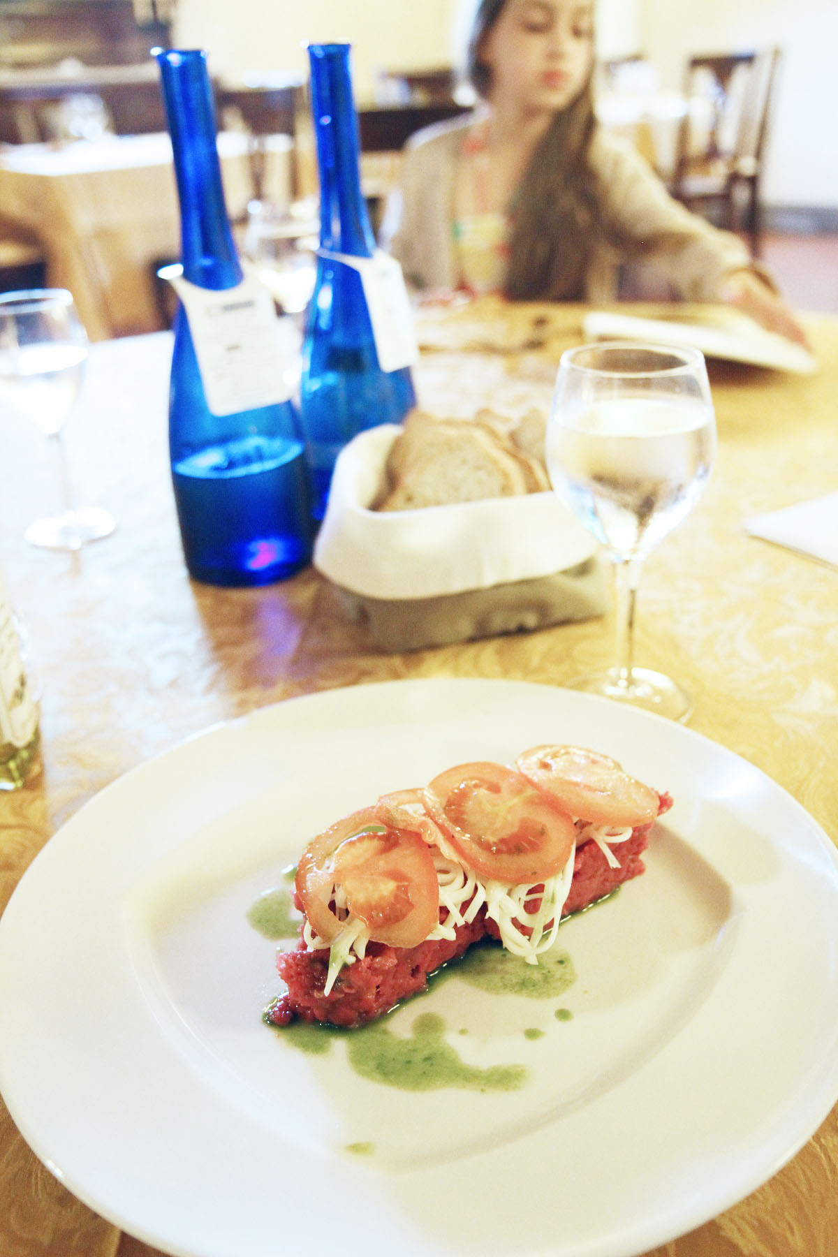 Hrm… Ett litet misstag i beställningen av förrätt… Jag tyckte att det lät väldigt gott med ”tartare di angus italiano” som serverades med persiljesås, tomat och parmesan, kunde jag utläsa av menyn. In kommer råbiff. Förstås. Det borde jag ha kunnat gissa mig till. Det kändes inte bra att inte ens smaka på maten, särskilt som de hade ambitioner på den här restaurangen. Servitören hade dessutom en väldigt speciell mustasch…