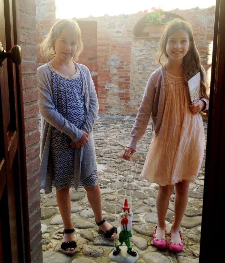 Jackies gulliga Pinocchio som marionettdocka. Bella valde en skrivbok, den hon har under armen, med det vackra toscanska landskapet på omslaget.