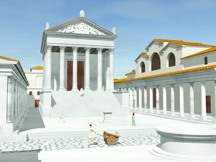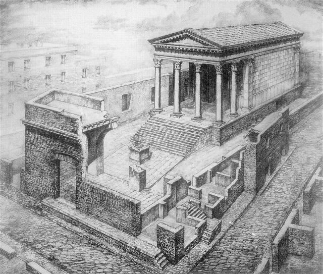 Det här är vad som finns kvar av ett tempel som troligtvis var tillägnat krigsguden Mars… Tempio Collegiale. Jämför med bilden här nedanför så ser ni att delar av ingången finns kvar, liksom altaret och trappan upp till templet. Allt var täckt av vit marmor.