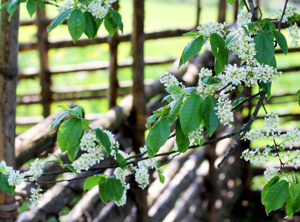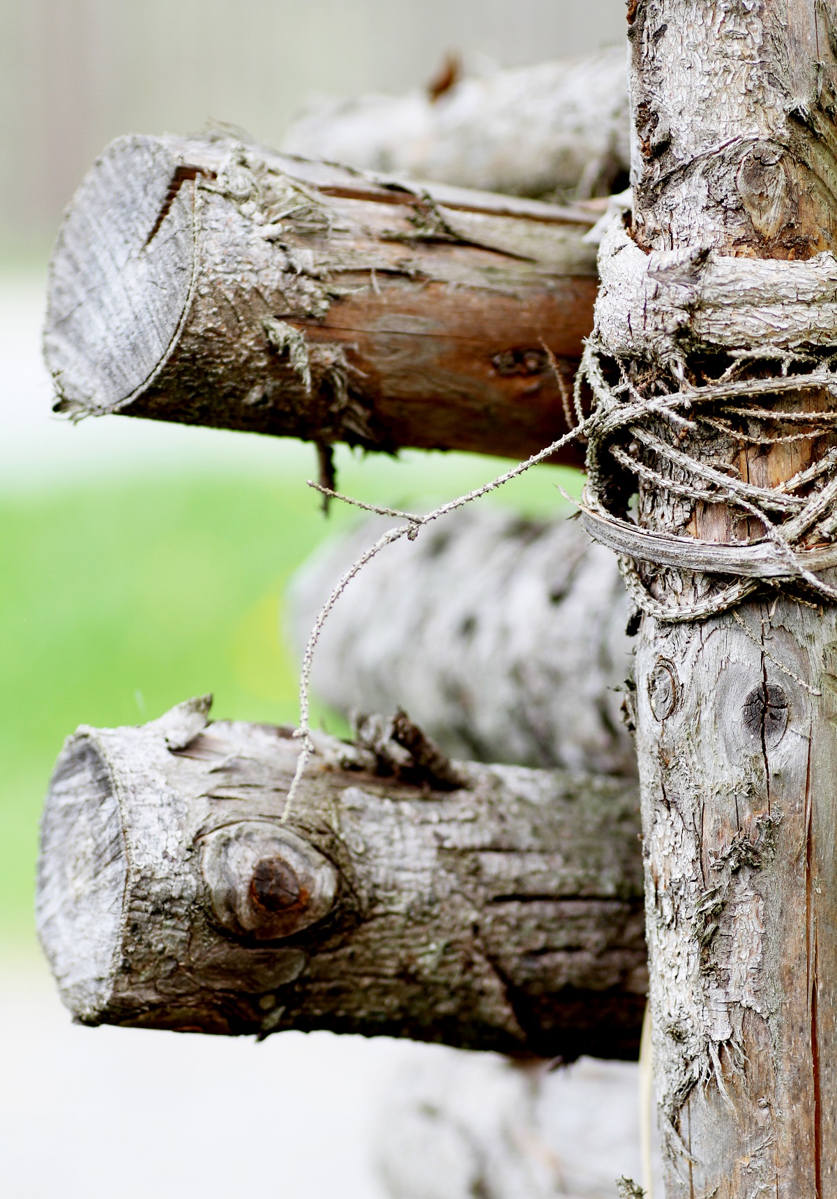 En traditionell gärdsgård består bara av naturmaterial, varken färg, kemikalier, spik eller ståltråd behövs. Man värmer smala grangrenar över öppen eld tills saven kokar i grenen och gör den böjlig som en gummislang. Då har man i regel inte mer än någon minut på sig att sno vidjan kring stolparna innan vidjan stelnar. Här använde jag mitt Tamron 90/2,8 för att få en riktigt skarp bild på barken och vidjorna.