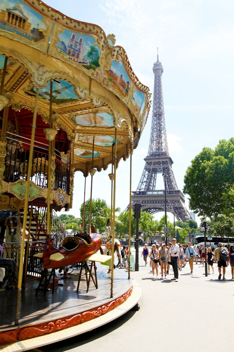 Den välkända vintagekarusellen med två våningar på ena sidan av bron över Seine till Eiffeltornet, Pont d’lena.