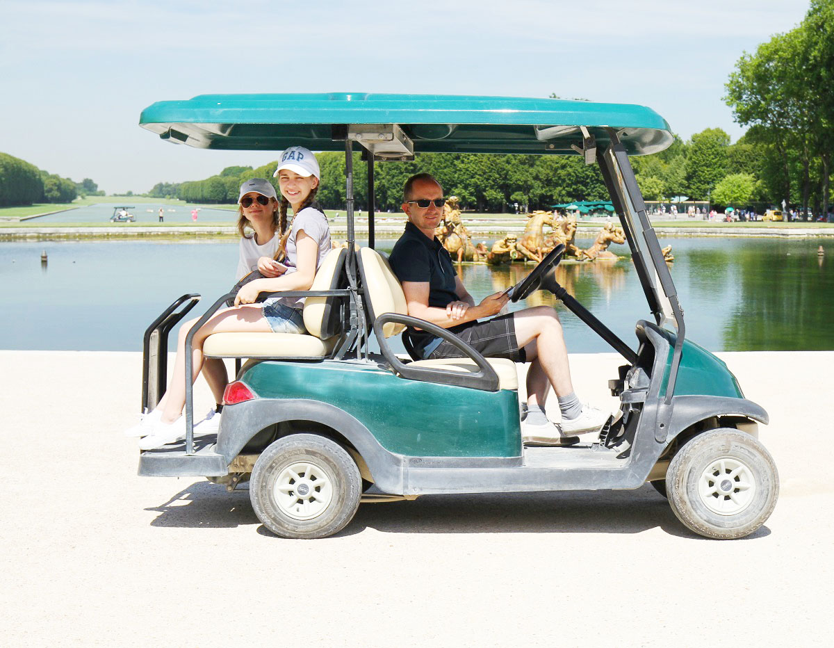 I nästa inlägg berättar jag om vår upplevelse av Versailles, det största kungliga slottet i världen. Här sitter familjen i den golfbil vi hyrde för att ta oss runt i den enorma slottsparken.