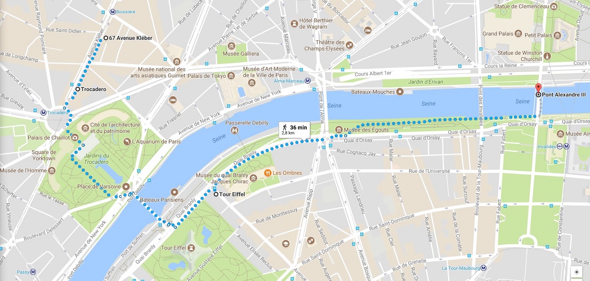 Så här såg vår promenad ut i Paris, bortsett från att vi sedan också gick över bron Pont Alexandre III till andra sidan av Seine och tillbaka till utgångspunkten där vi parkerat bilen, vid Avenue Kléber. Som jag nämnt här, använder vi alltid Google maps när vi planerar våra resor. Det är lätt att tro att avstånden är kortare än de faktiskt är, men med google maps har man koll.