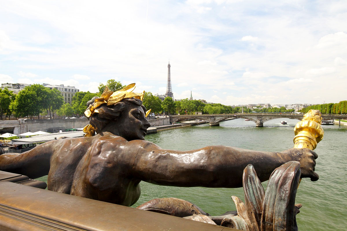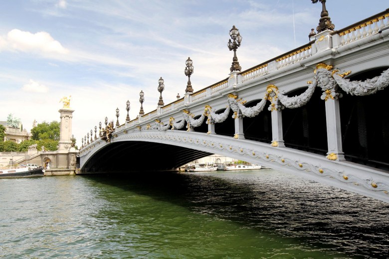 Promenaden längs Seine kändes antagligen längre än vad den hade gjort en svalare dag, men till slut såg vi den – Pont Alexandre III. Och titta vilken tur jag hade när jag fotade, som fick med en fransman i basker också – så franskt :)