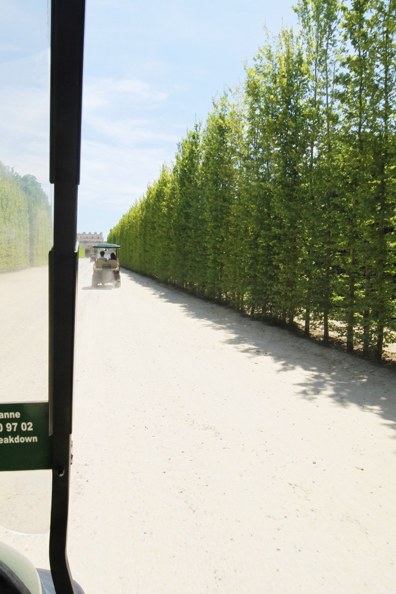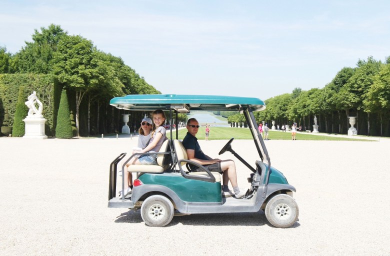 Eftersom de flesta började besöket med att se slottet, var vi bland de första till kön för att hyra en golfbil. Tänk bara på att du inte kan gå tillbaka in i slottet igen när du gått ut i parken. För att komma tillbaka in i slottet måste du köa i två timmar igen, på franskt vis…