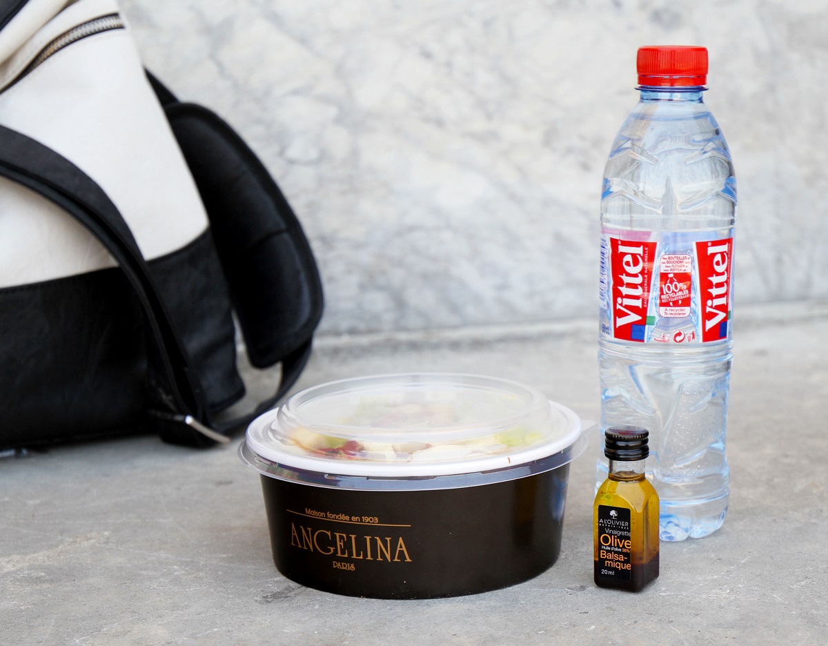 Jag beställde en kycklingsallad och en flaska vatten. Till salladen fick man förstås inte någon kladdig dressing, utan en söt liten flaska med en vinägrett av olivolja och balsamvinäger. Man måste bara beundra fransmännen för deras finess när det gäller mat. Till och med när man köper snabbmat är den stilfullt paketerad!