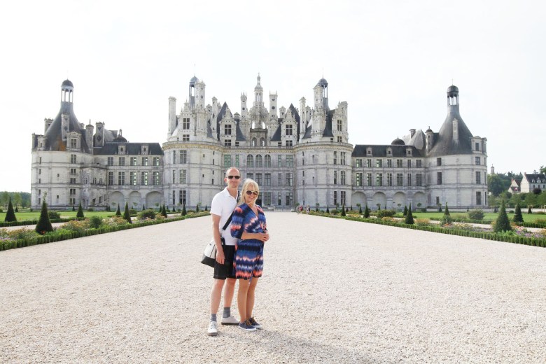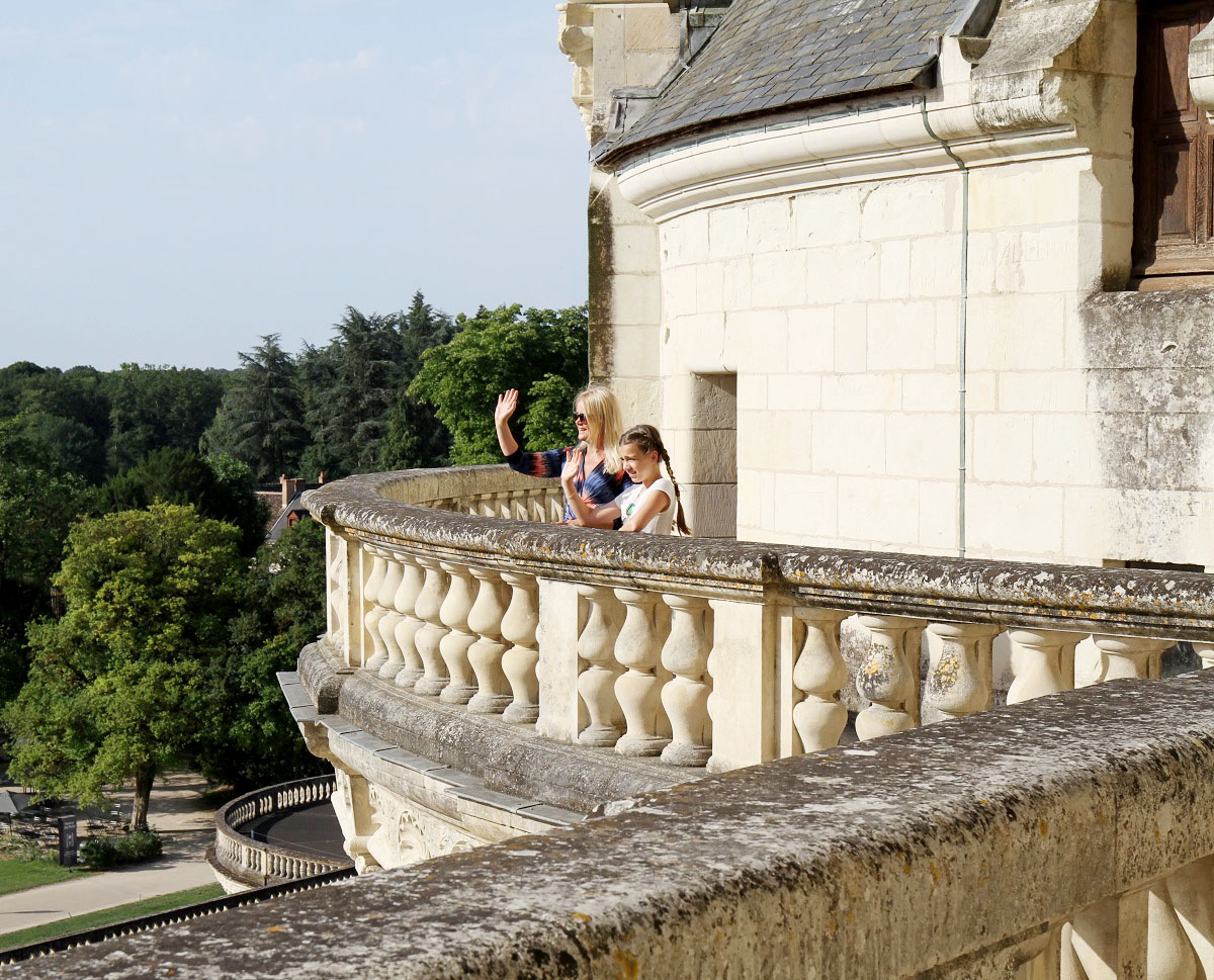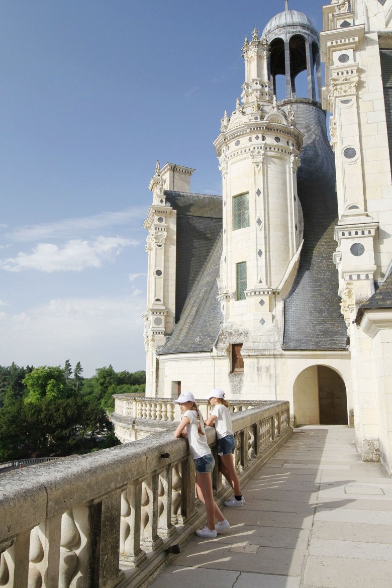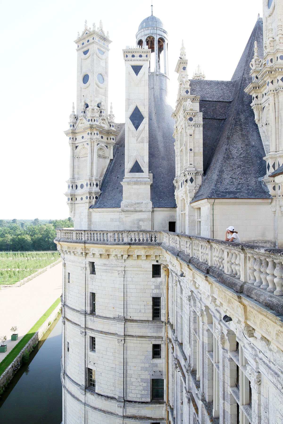 Slottet i Chambord är känt för sin franska renässansarkitektur som blandat medeltida former med klassiska italienska strukturer. Jag gillar det väldigt mycket. Kraftfullt, men ändå detaljrikt med mjuka fina former i vackra material. Här tittar Jackie ut mot slottets park på baksidan. Så läckert att kunna gå längs en takterrass runt hela slottet, vilken utsikt man hade! Och så vallgravar runt, precis som hos slotten i sagor.