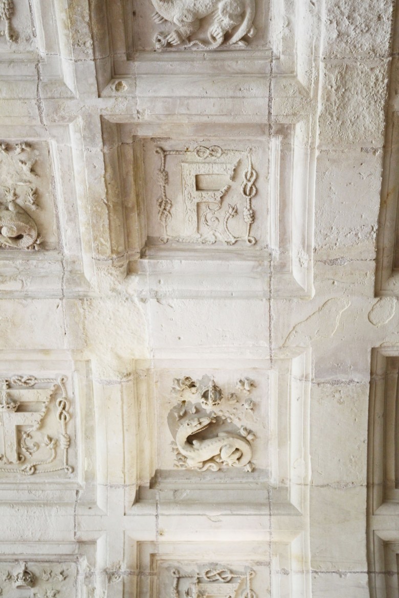 Under den här resan har vi verkligen fått höja blicken och titta lika mycket på taken som på väggar och golv. Taken har imponerat mycket på mig. Vilket arbete man lagt ned på något som man kanske sällan tittar på och uppskattar. Särskilt med tanke på takhöjden. Man måste böja nacken rejält bakåt för att kunna se motiven. Salamandern var hur som helst symbol för Frans I, och därför fanns den i taket i många av slottets rum.