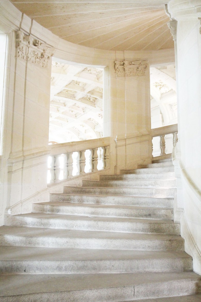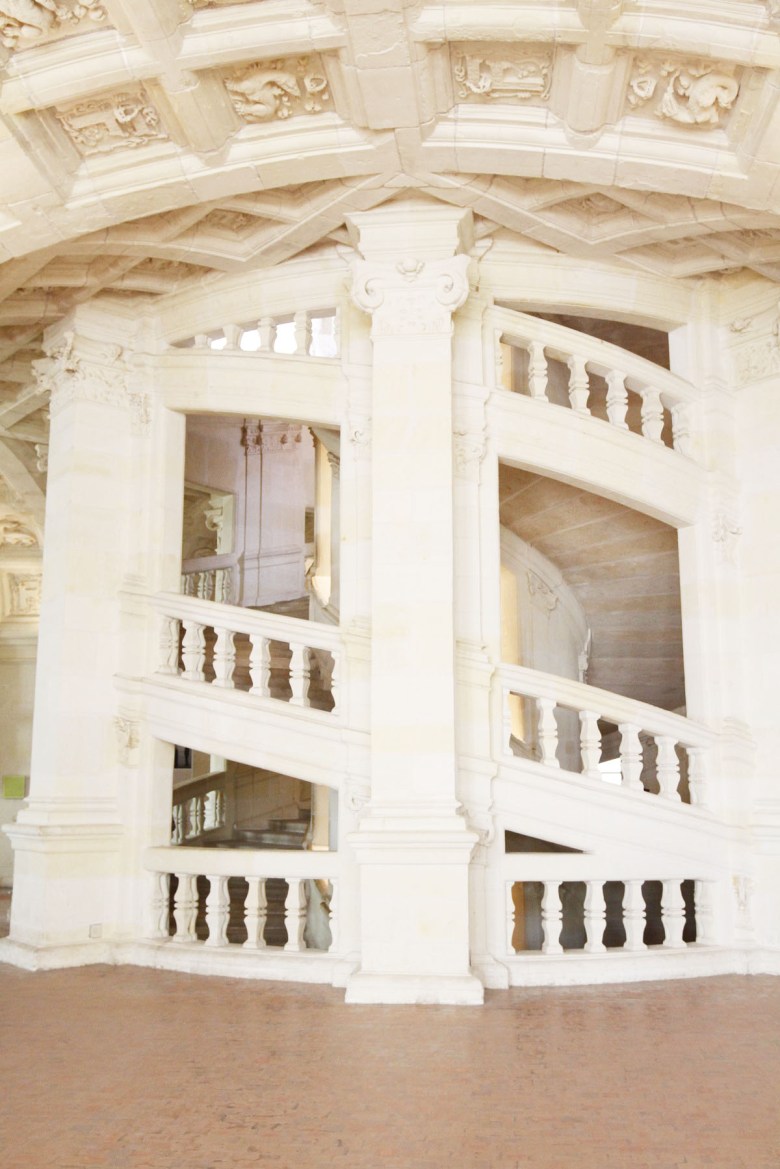 Så vacker trappa för att ta oss upp i slottet. Men den är inte bara vacker, den är också helt unik i sin konstruktion. Det är dubbeltrappor i form spiraler som ligger mitt i slottet. De två trapporna går genom tre plan utan att mötas och lyses upp från ovan av ett slags ljusgård högst upp i slottet.