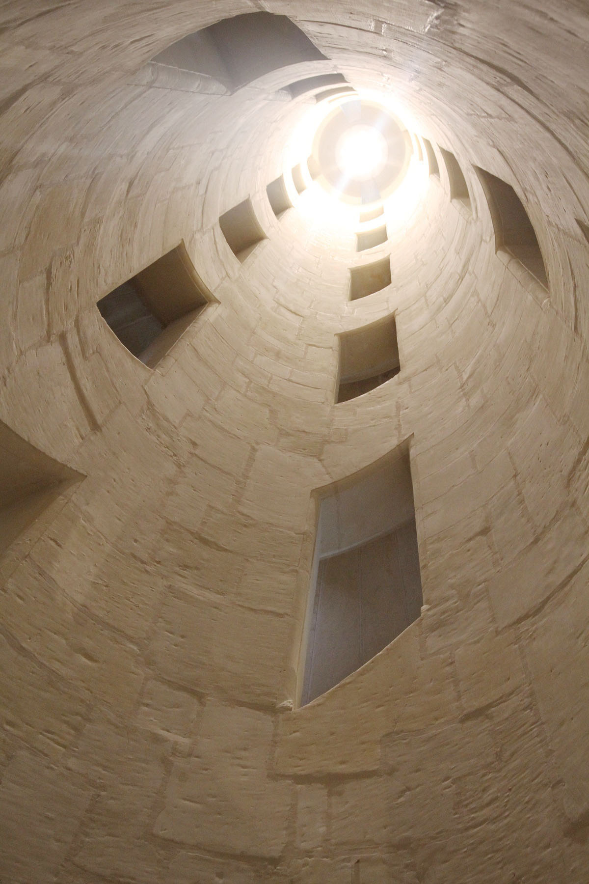 Så här ser det ut om man tittar rakt upp mot ljusgården. Bakom gluggarna vindlar sig trapporna i mitten av slottet.