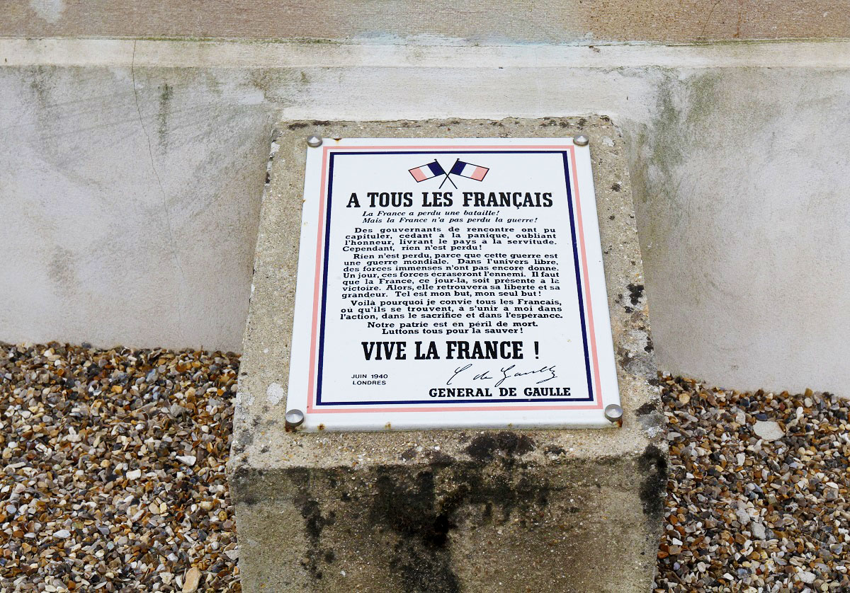 Oväntade platser och händelser är nästan alltid det bästa på resor. Man lär sig nya saker. Vid minnesstenen över människor från byn som stupat i Första Världskriget, fanns också den här plaketten från Andra Världskriget. Charles de Gaulle uppmanar fransmännen att tillsammans med honom kämpa vidare och inte se sig besegrade, trots de slag som förlorats. En dag skall fienden krossas och Frankrike återfå sin frihet och sin storhet. Leve Frankrike!