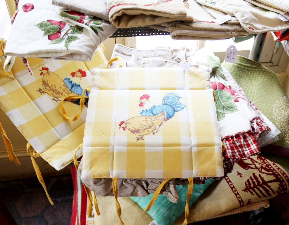 I butiken vid slottet i La Roche-Guyon, nära Giverny i Normandie, fanns tyger och annat med både hönor och tuppar.