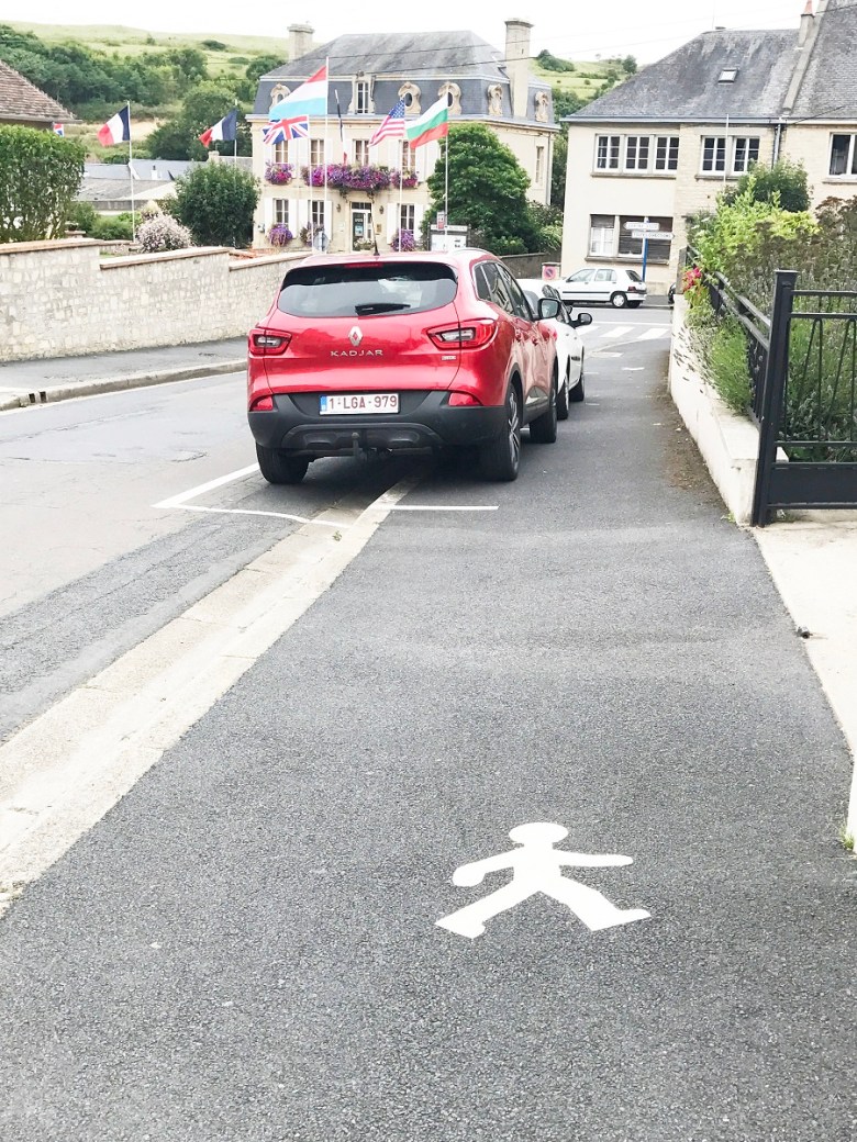 Japp, så kan man lösa problemet med för smala gränder där man ändå vill få plats med både breda trottoarer, bilväg och parkeringsrutor… Kreativt tänkande på franskt vis.