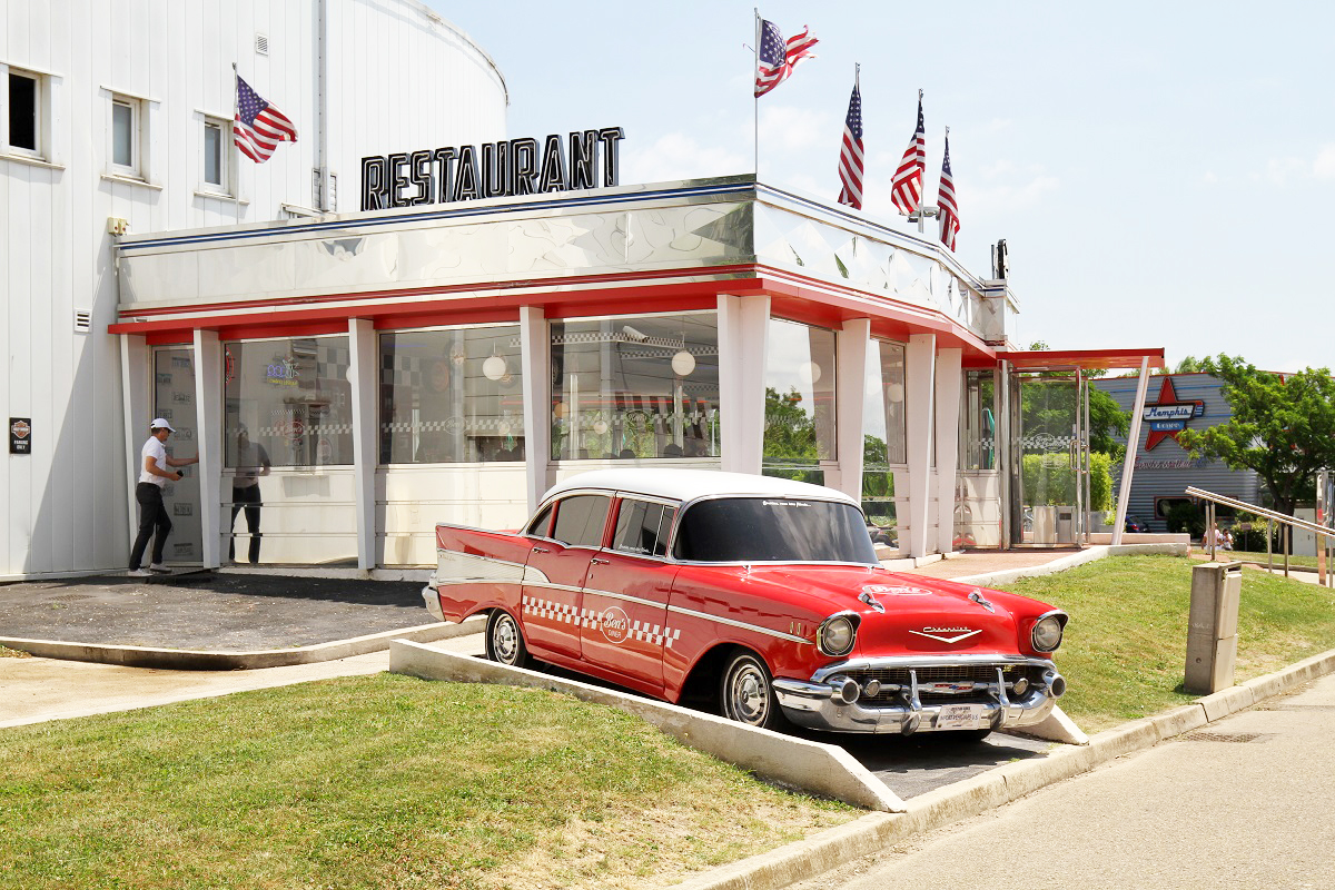 I Nîmes finns ett snabbmatsställe inrett som en amerikansk 50-talsdiner. Vi parkerade och såg direkt vilket ställe det var. Trodde vi, ja… och lät oss luras av amerikanaren som stod parkerad utanför ett helt annat ställe ;)