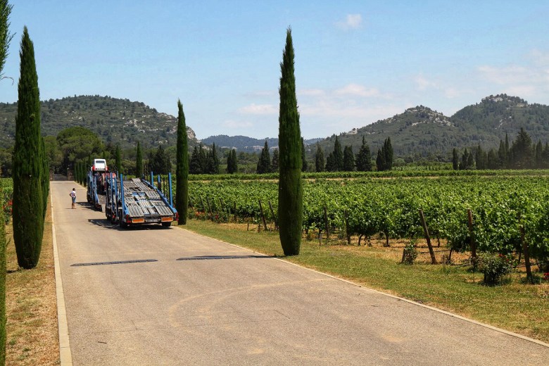 Den stora lastbilen med släp och en liten fransk bil, och så chauffören som ser ut som en leksaksfigur bredvid, mitt i den dramatiska omgivningen med vinrankor och höga berg – jag var ju bara tvungen att fota!