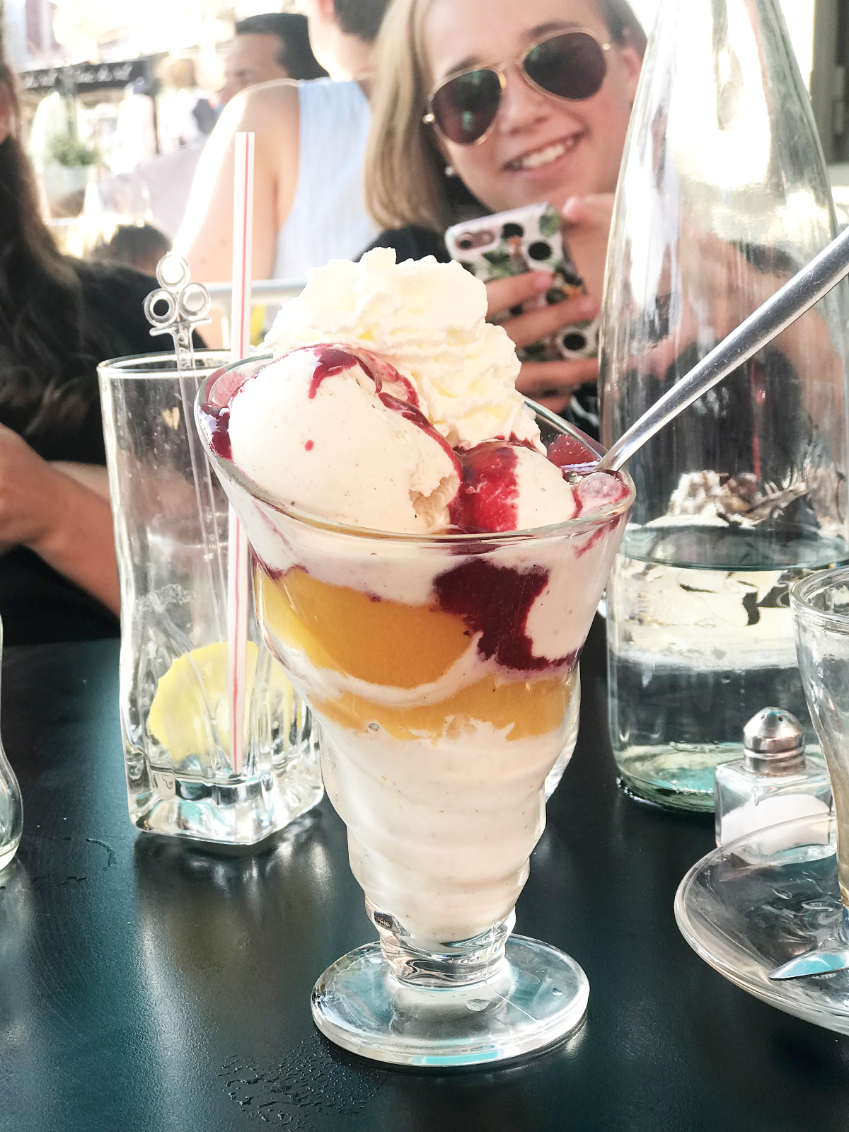 Avrundar inlägget från Cassis med en bild på efterrätten som Jackie och jag delade. Jackie är också på gång att fota. Minns nu vilket otroligt fint mobilskal hon hade, med papegojor.