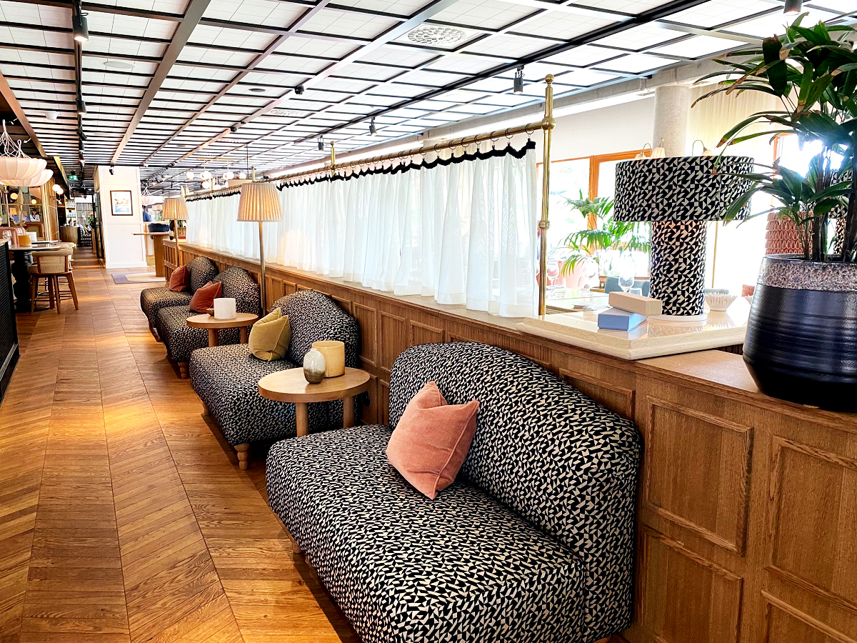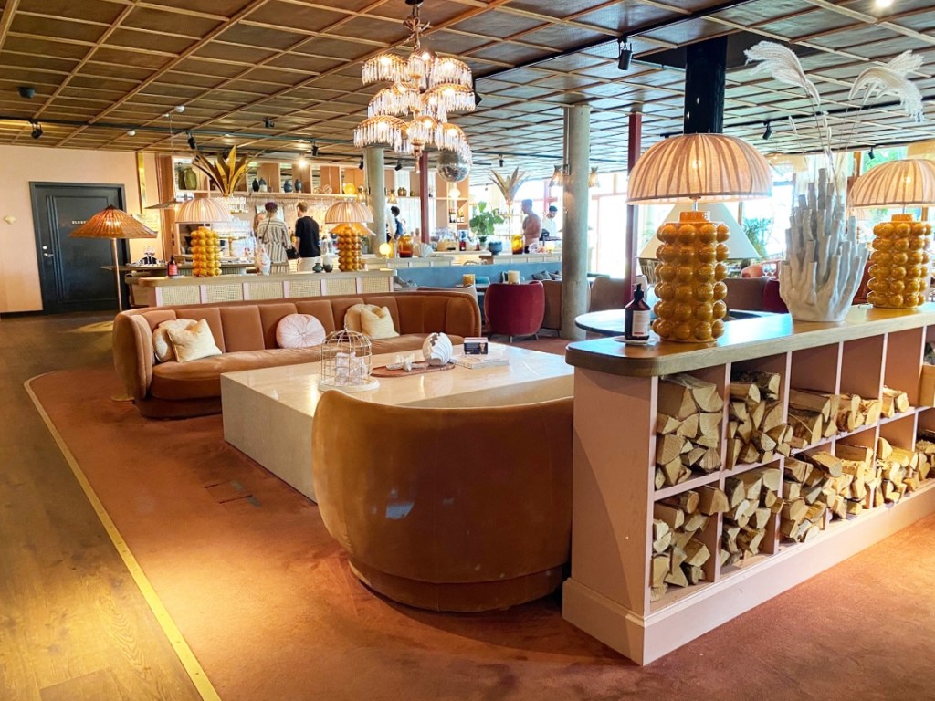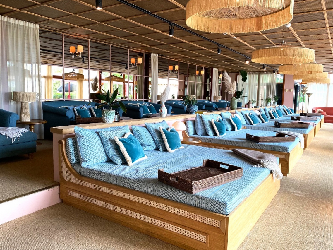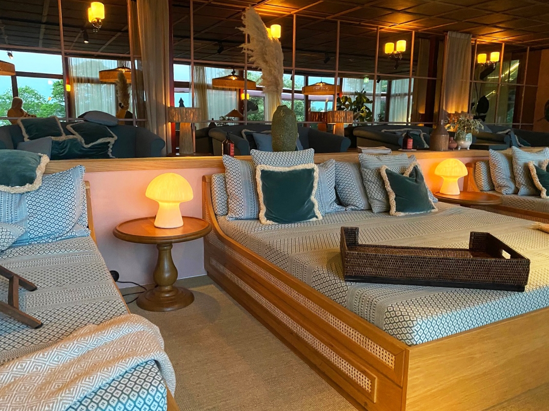Man möts direkt av den snygga receptionsdisken, som är helt i stil med resortens övriga inredning. Långt ifrån 1990-talets i mitt tyckte sterila och litet fega trend, ”vitt och fräscht”. Här är det jordfärger med inslag av pastell, och naturliga material som ger en ombonad, mysig känsla. Lägg märke till alla fina detaljer i inredningen. Mönster, konstverk, lampor.