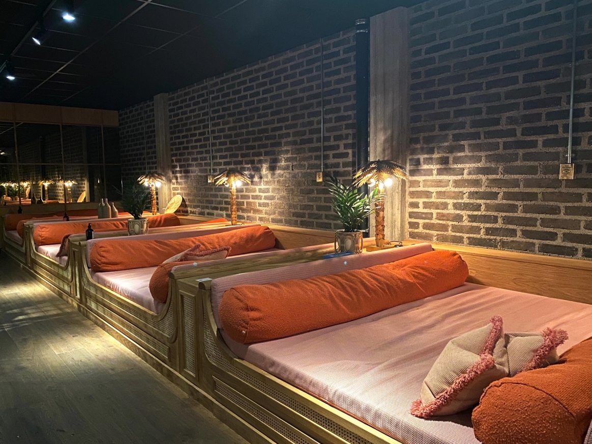 För att få tillgång till de uppvärmda poolerna, relaxavdelningen och solsängarna måste man boka in sig på tre timmar i taget i anläggningens Beach Club. Vi insåg på plats att det kostade trehundra kronor extra per person att kunna utnyttja det vi kommit dit för, att sola och bada och ta det lugnt i relaxavdelningen. Väldigt märkligt. Tillgång till relaxavdelningen borde väl ingå i priset för rummet. När vi fått varsin handduk av tjock och mjuk kvalitet visades vi de olika poolerna och relaxrummen. Trevligt!