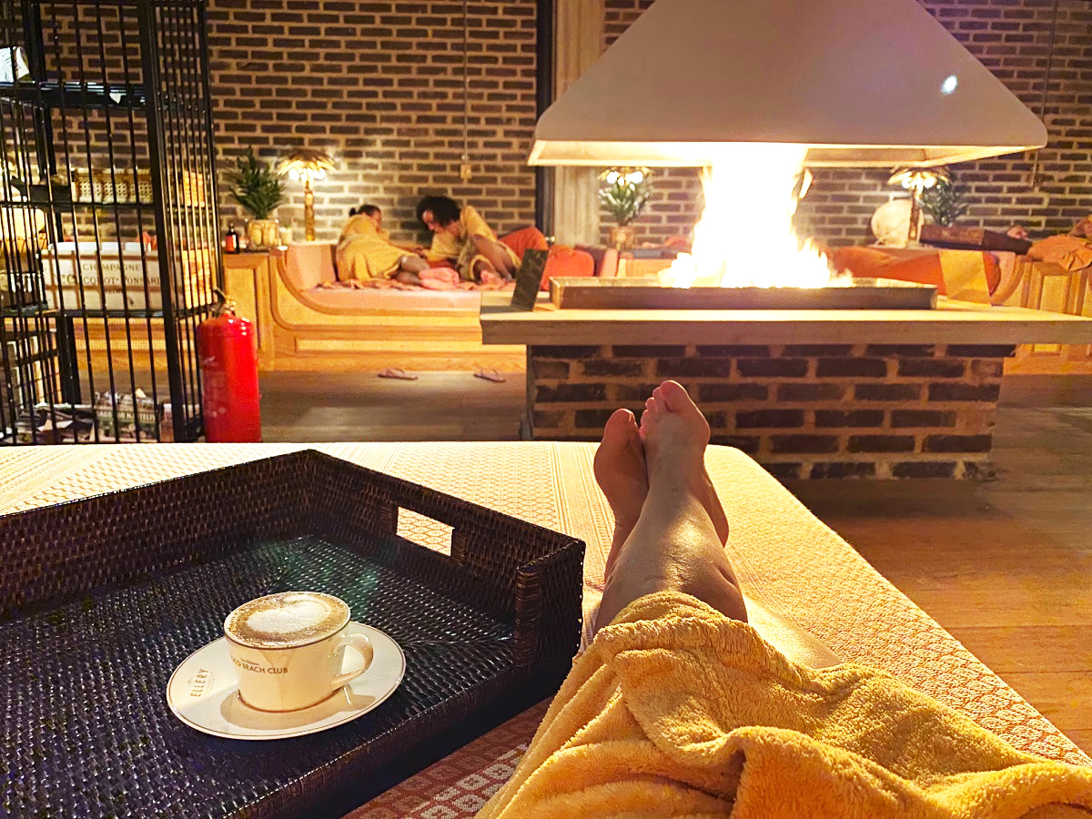 Efter middagen bytte vi om till badkläder, och den gula, mysiga badrock som låg på rummet tillsammans med badtofflor, och gick ned till relaxavdelningen. Jag trodde att jag skulle stå ut att ta det lugnt i max tio minuter, men tyckte att det kunde vara roligt att testa allt som finns på resorten. Efter fem minuter var jag så avslappnad att jag bara låg och vickade litet på tårna i takt till lugn musik och knastret från veden som brann. Eld-relaxrummet är som en liten härlig oas.