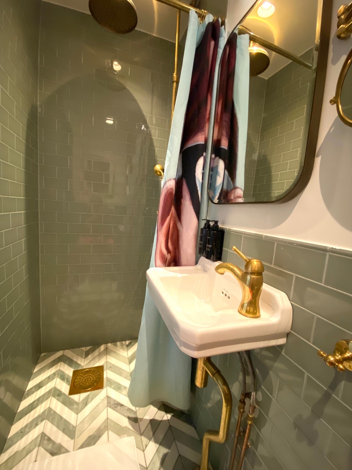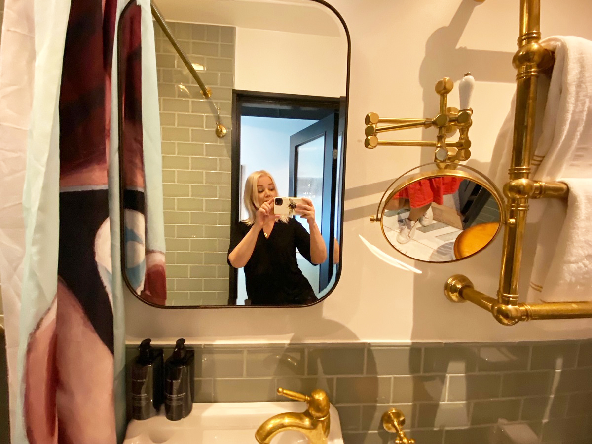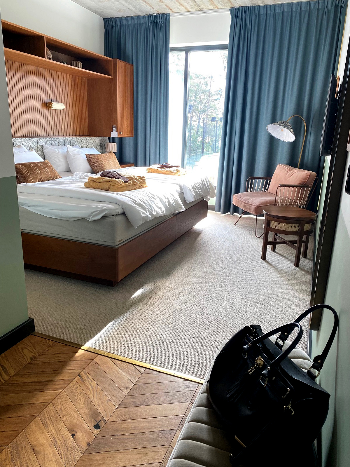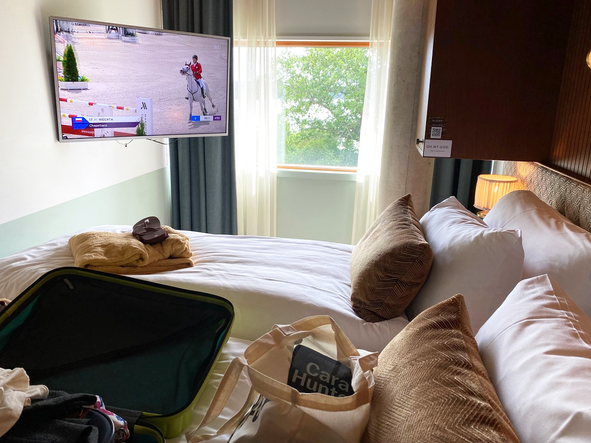 Jag hade bokat ett så kallat petite mini ocean-rum med utsikt över Höggarnsfjärden. Upp för en trappa och genom en smal korridor. Det är alltid lika roligt att se hur rummet är. Mitt var väldigt litet, egentligen fick det inte plats mer än en väldigt stor dubbelsäng, men alldeles lagom. Från de egna apparna på mobiltelefonen kan man logga in och streama filmer, det var nytt och positivt för mig. Innan jag skulle sova tittade jag en stund på Badhotellet, streamad från cmore. Och vilket underbart rum för wc/dusch! Dessutom spännande konst på väggarna i hela hotellanläggningen.