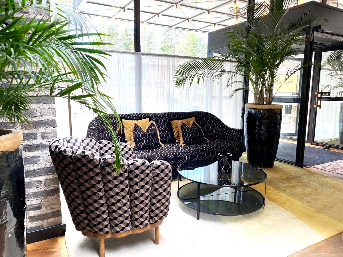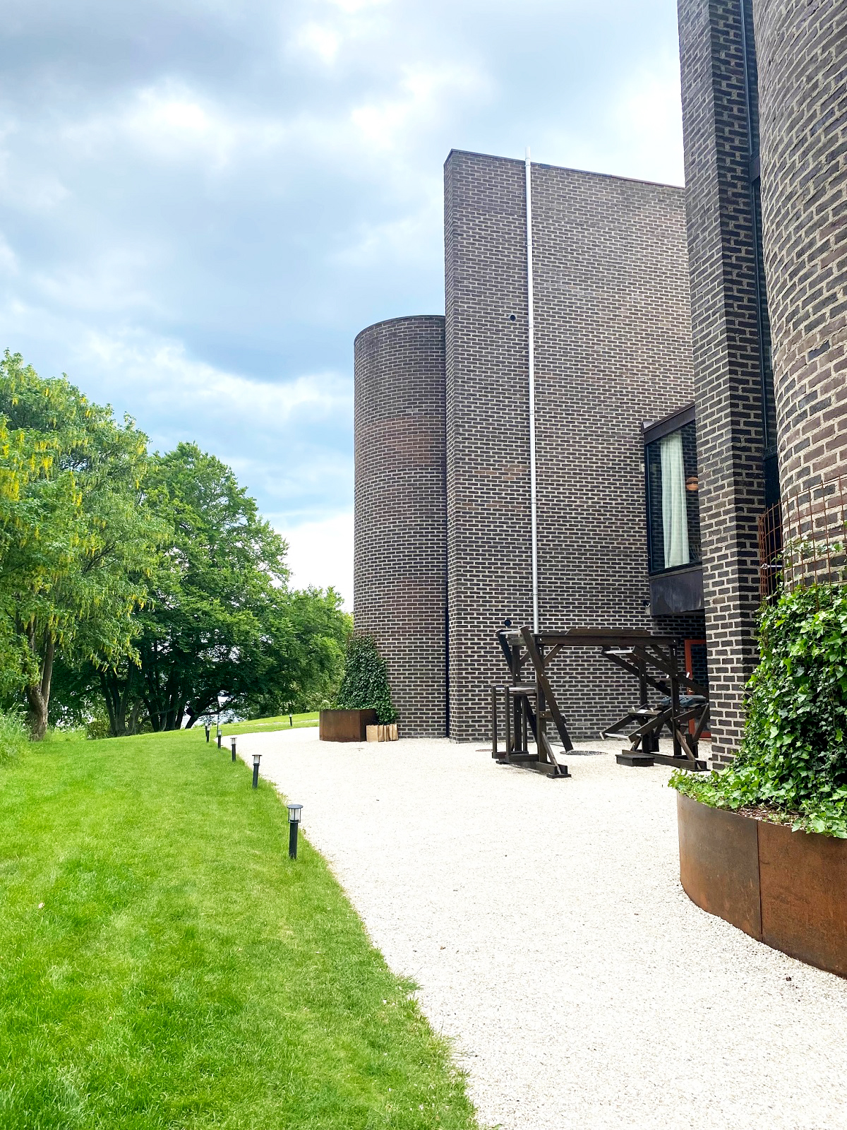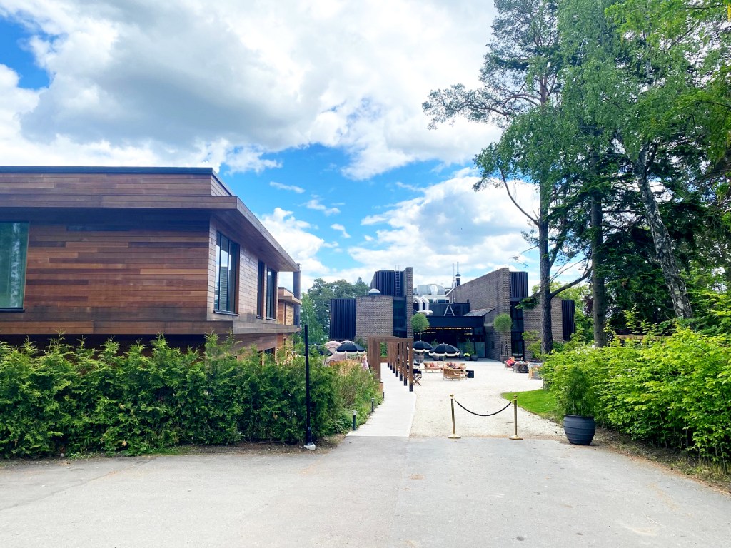 Anläggningen byggdes mellan 1966 och 1969 i handslaget tegel som kursgård för IBM. Den byggdes sedan om år 2003 till en hotell- och konferensanläggning och år 2020 nyöppnades den i ny regi och med ny design. Jag skriver design, för det här är verkligen ett designat hotell. Väldigt snyggt, ni skall strax få se. Men först skall vi se på exteriören. Ser ni tornen i hörnen av den äldre byggnaden? Det är trapphusen mellan våningarna. Jag visar bild på hur de ser ut inifrån litet längre ned i inlägget.