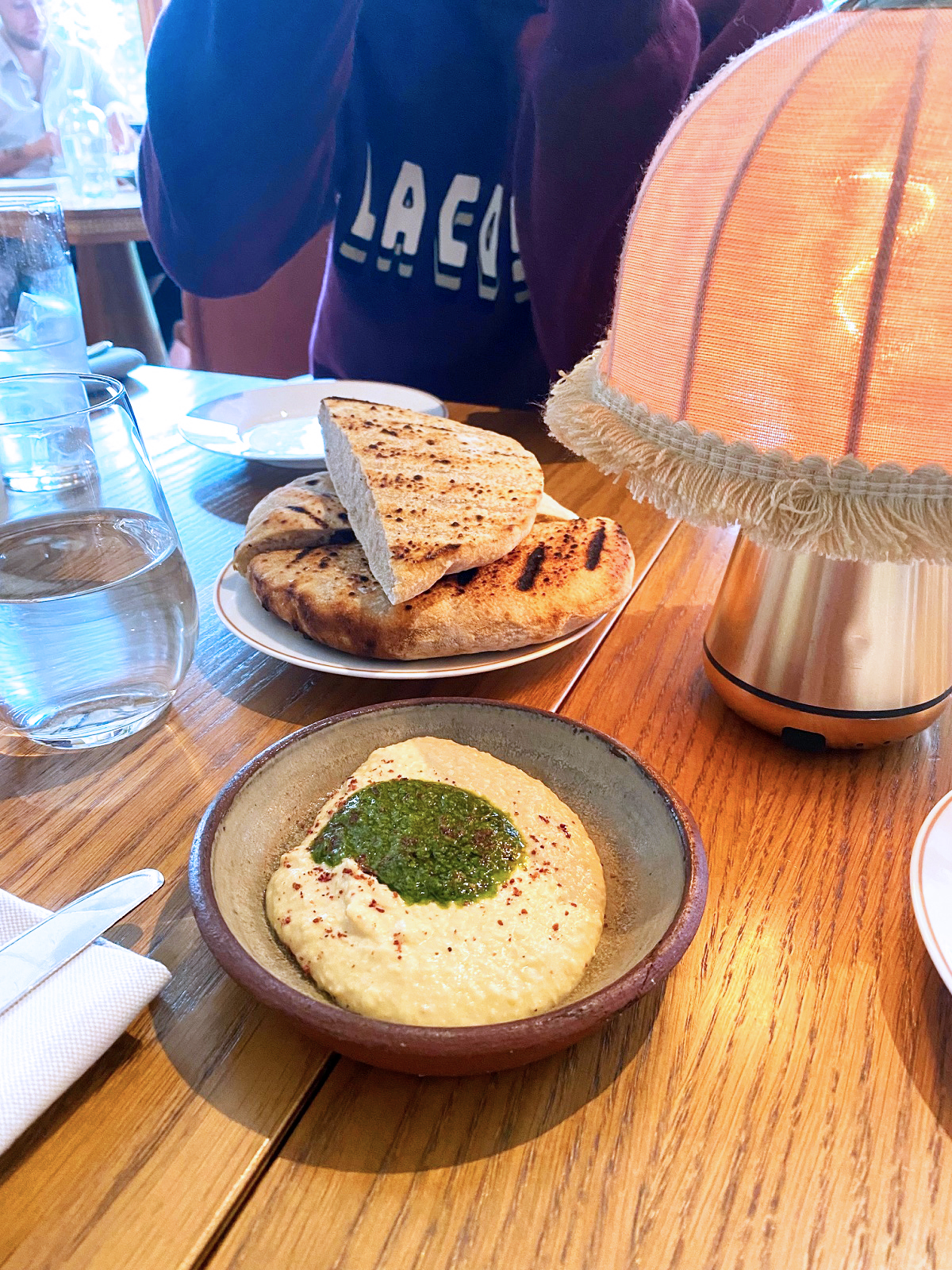 Vi hade fått en tid för middag klockan 18.30, och det gick inte att ändra tiden till senare. I väntan på varmrätten blev vi serverade ett grillat bröd och en väldigt god hummus att dippa brödet i. Jag åt flankstek med grillade grönsaker som serverades med en otroligt god ramslökssås. Till efterrätt mangosorbet med basilika, macadamianötter och kokos.