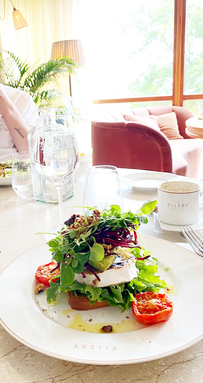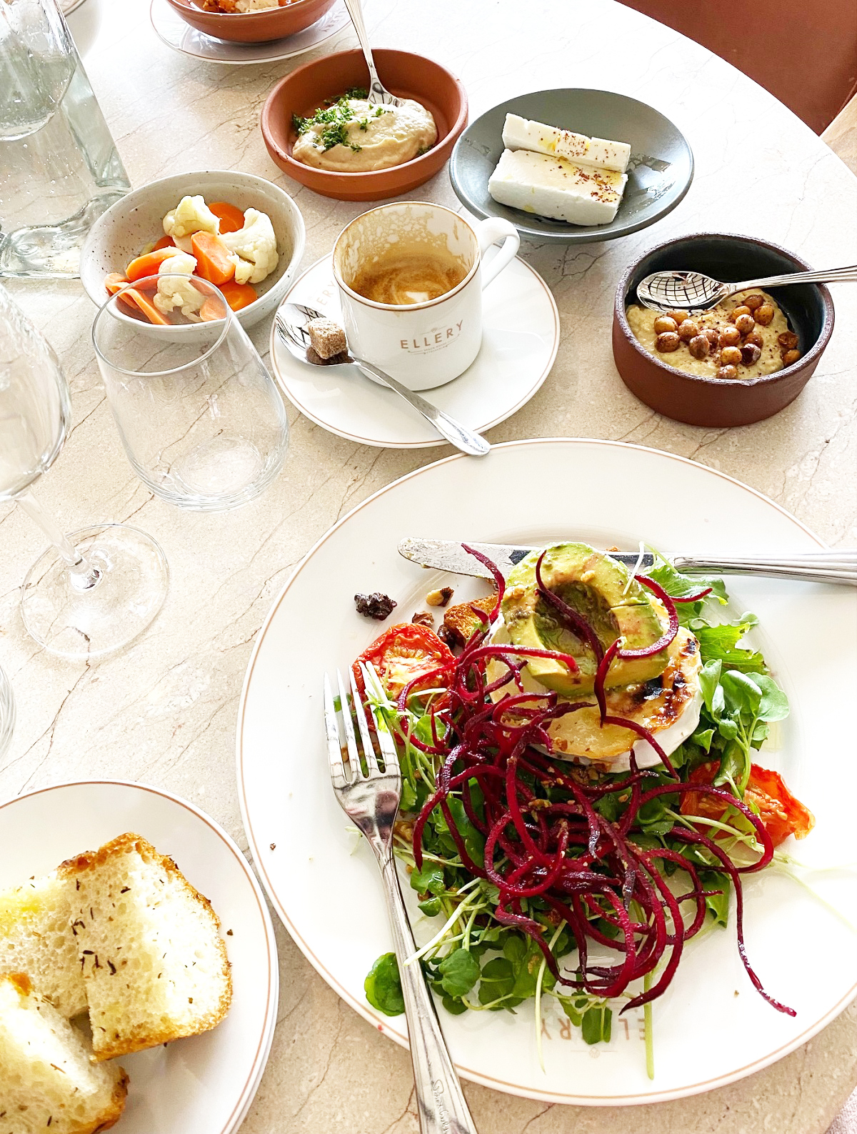 Efter incheckning och en snabbtitt på rummen möttes vi i restaurang Palmers för brunch. Jag valde några smårätter: rip & dip, foccacia, hummus, fetaost, pickles, ezme och baba ganoush, och en chèvretoast med honung, avokado, strimlad rödbeta och valnötter. Otroligt snyggt dekorerad toast! Och hummusen var väldigt god.