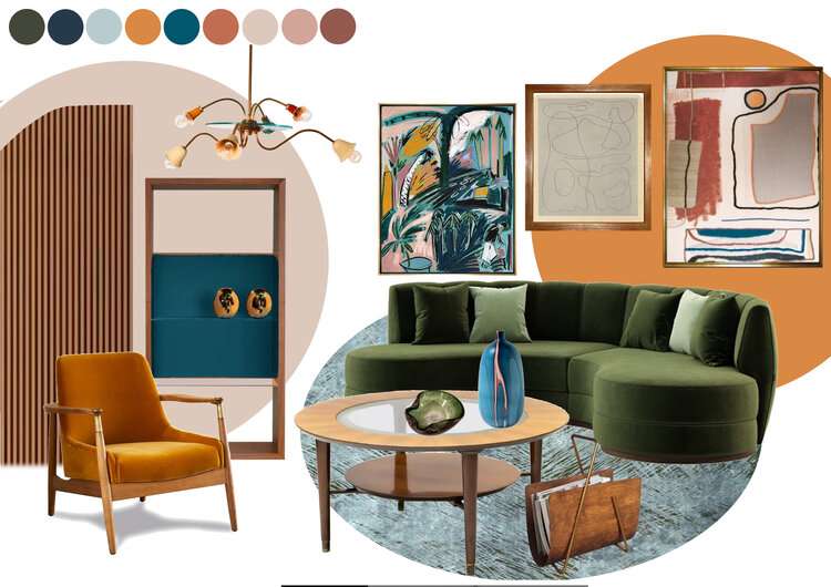 Inredningen skulle kunna vara inspirerad av dessa moodboards med design från mitten av 1900-talet. Jag gillar det verkligen. Hemtrevligt, varmt och inbjudande.